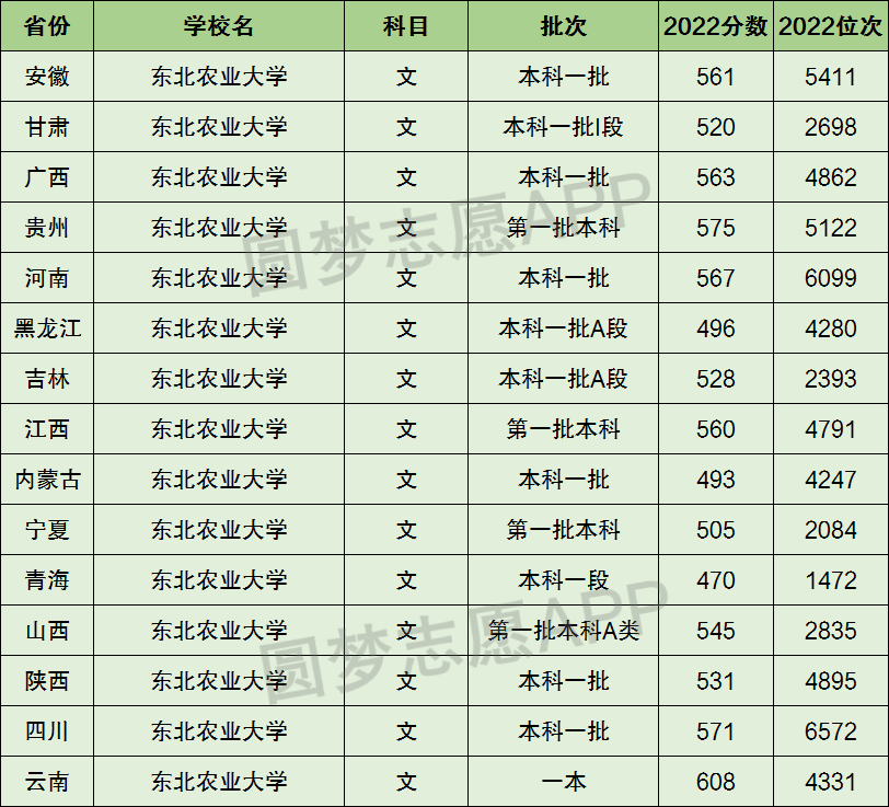 1、东北农业大学在全国普通高考省份的【文科】招录数据,包含招生批次等信息: