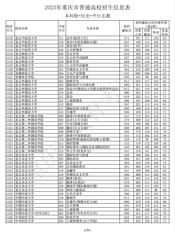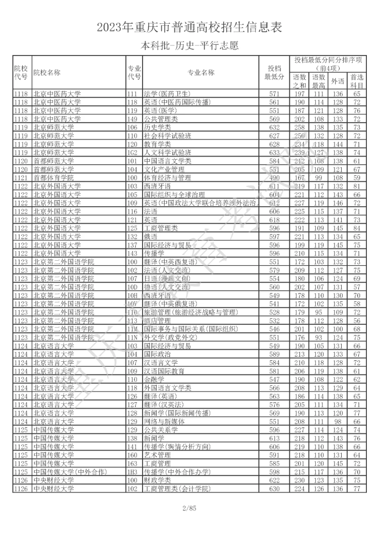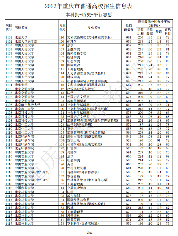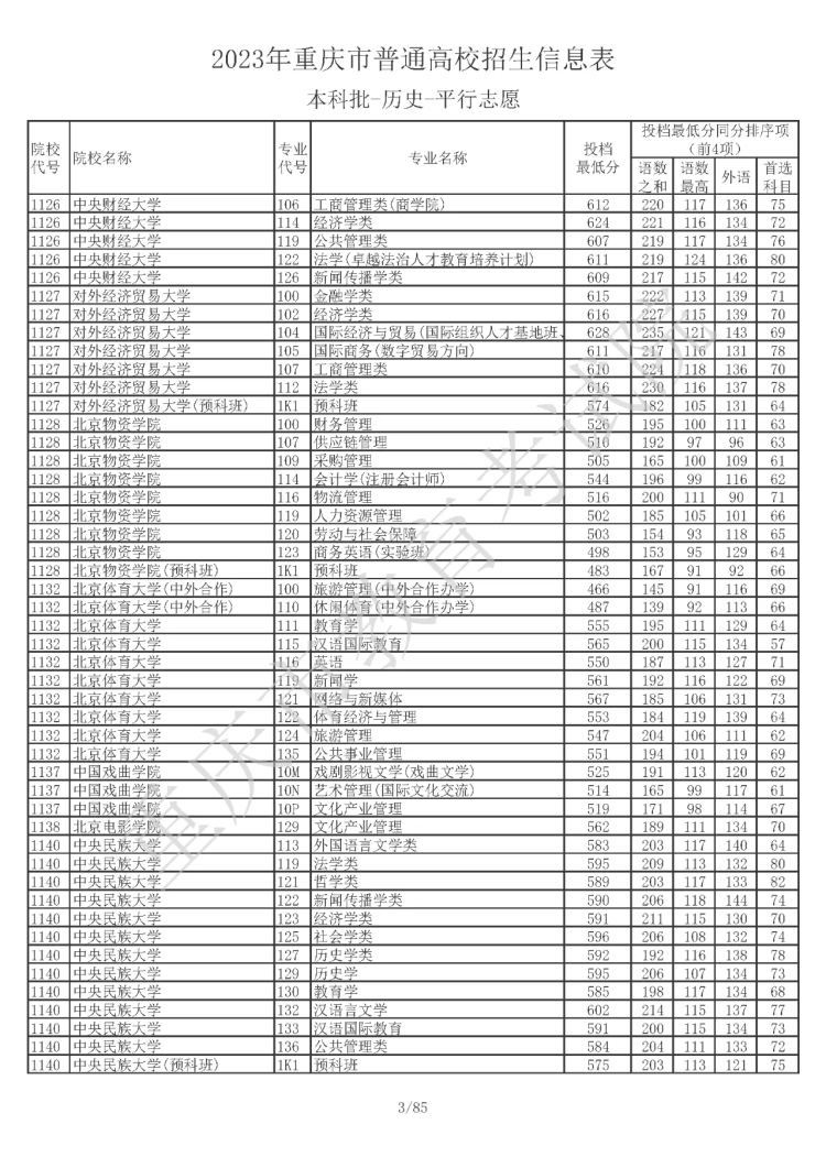 2023年重庆市普通高校招生本科批-历史科目组合平行志愿投档录取分数线一览表