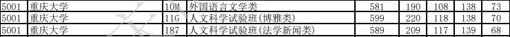 重庆大学最低录取分数为外国语言文学类581分,其次是人文科学试验班(法学新闻类)589分、人文科学试验班(博雅类)599分;