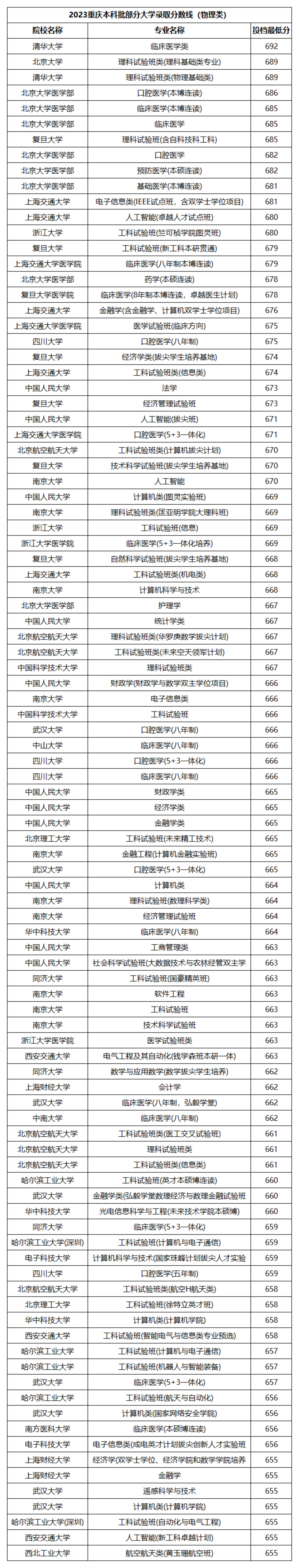 2023年北大清华及重庆大学在重庆物理科目组录取分数线为:北京大学理科试验班最低投档分数线689分;清华大学理科实验班最低投档分数线689分,临床医学类最低投档分数线692分。重庆大学工科试验班最低投档线585分,外国语言文学类最低投档线586分。