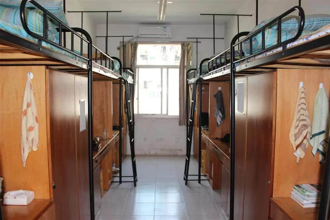 综合楼:一边两张上下铺床,另一边桌加柜子,一般住四人,每个寝室都配备独立卫生间,楼下有洗衣房并且寝室里有阳台可以晒衣服。