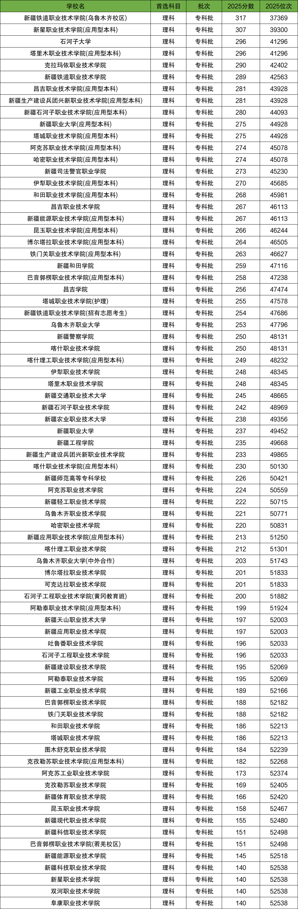 2025年新疆维吾尔自治区各专科大学录取分数线最低是140分、最高是317分。