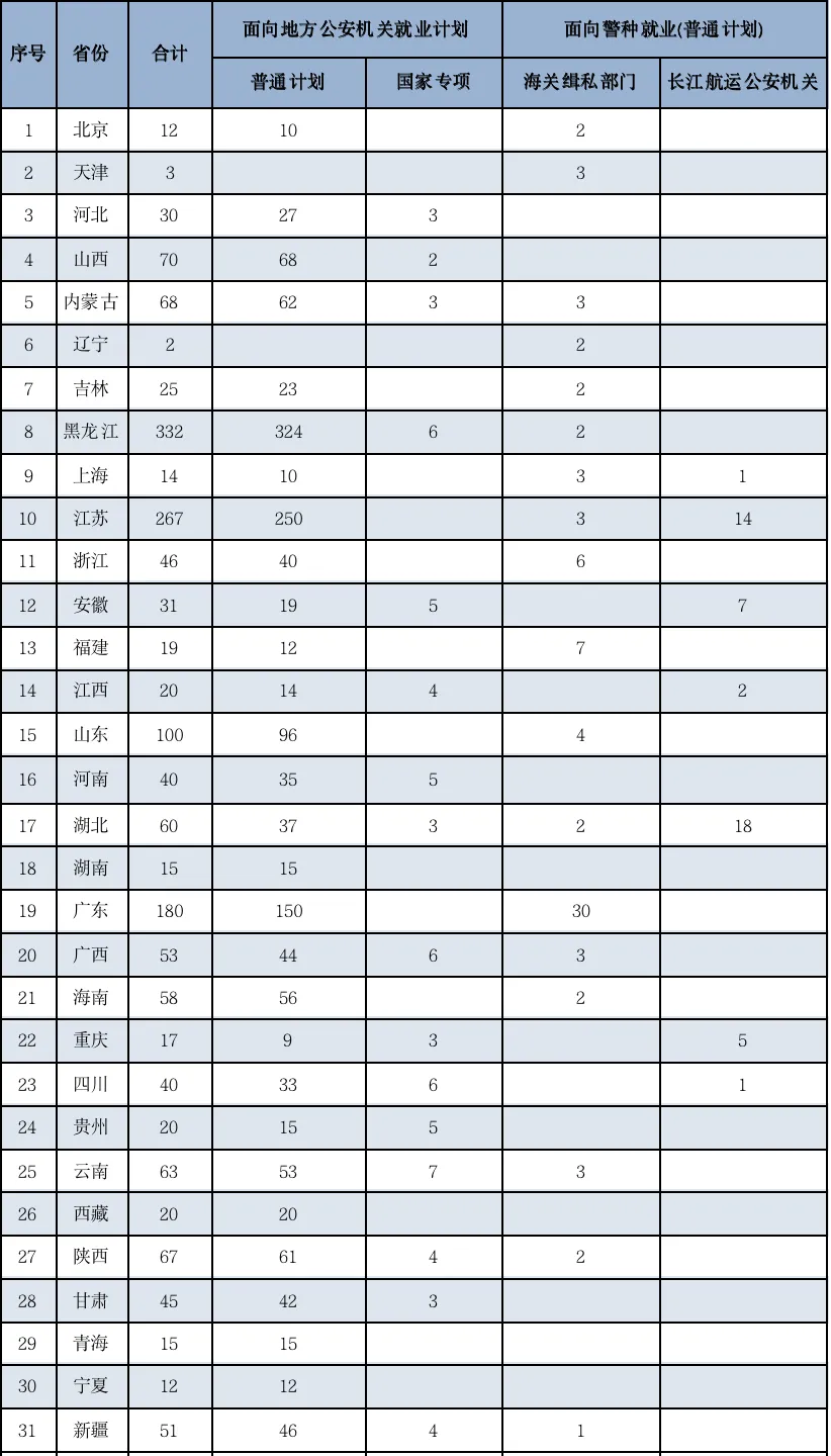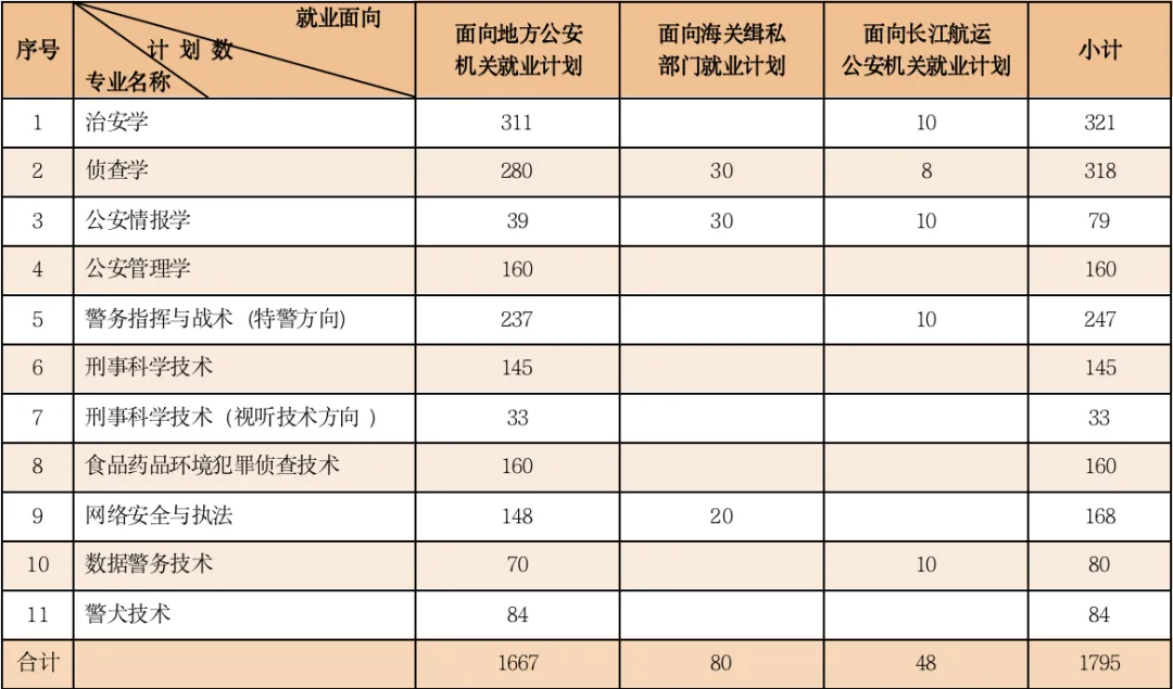2024年招生计划1795人,其中北京市面向地方公安机关招生10人。其招生专业及人数,预分到各省的情况如下。