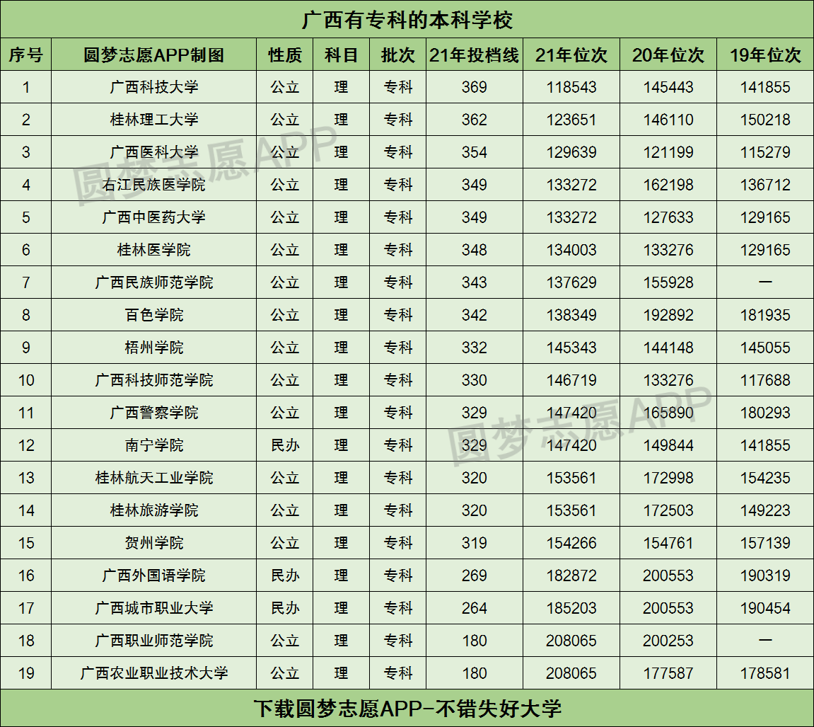 根据广西考试院公布的数据,圆梦志愿小编为大家整理了位于广西壮族自治区内、且在专科批次有招生的本科大学名单,其中包含16所公办大学和3所民办大学。