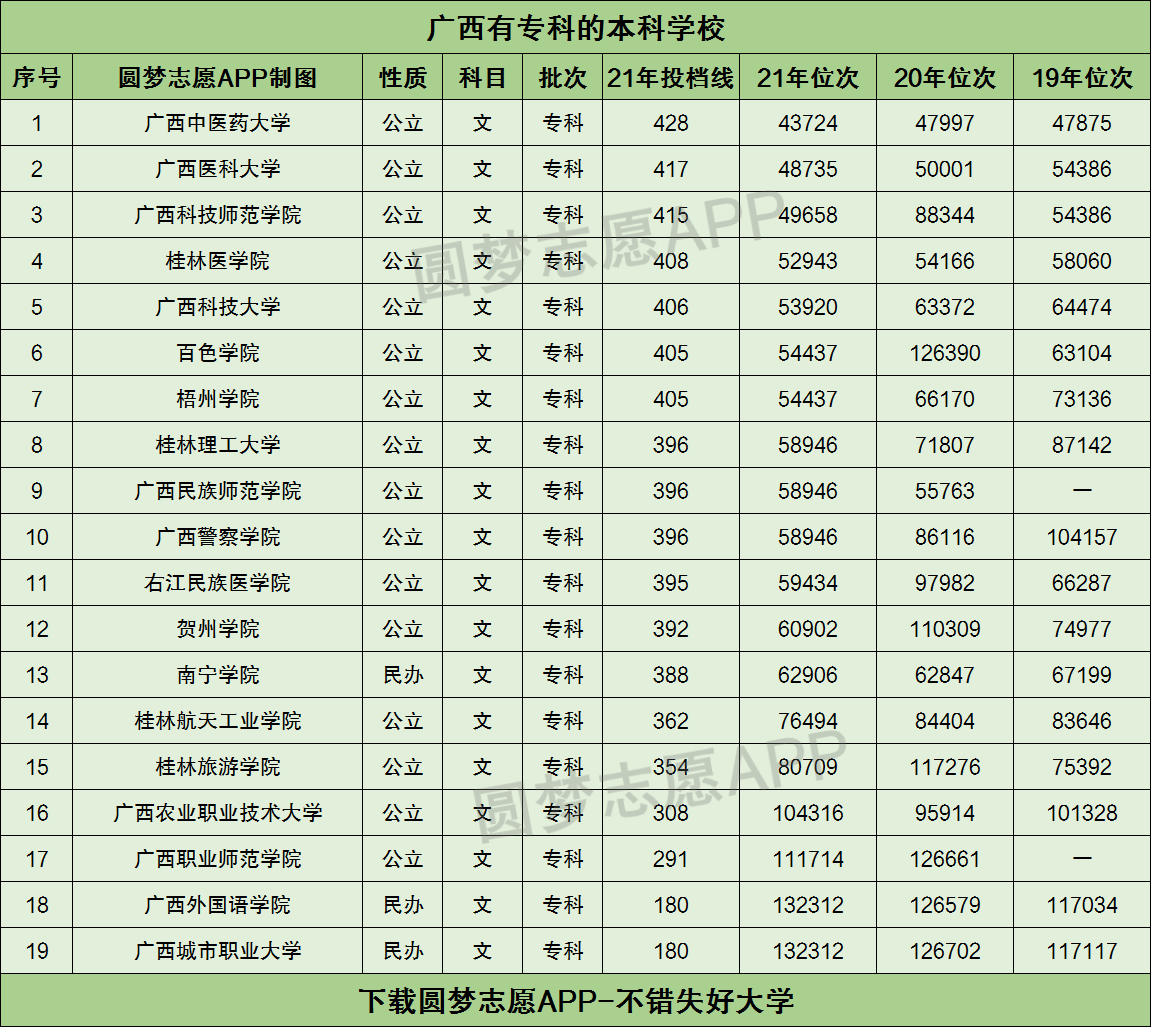 根据圆梦志愿APP提供的全国大学在广西壮族自治区近三年的招录数据,小编为大家整理出了广西有专科的本科大学分数线及最近三年的最低录取位次。