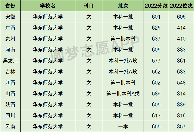 1、华东师范大学在全国普通高考省份的【文科】招录数据,包含招生批次等信息: