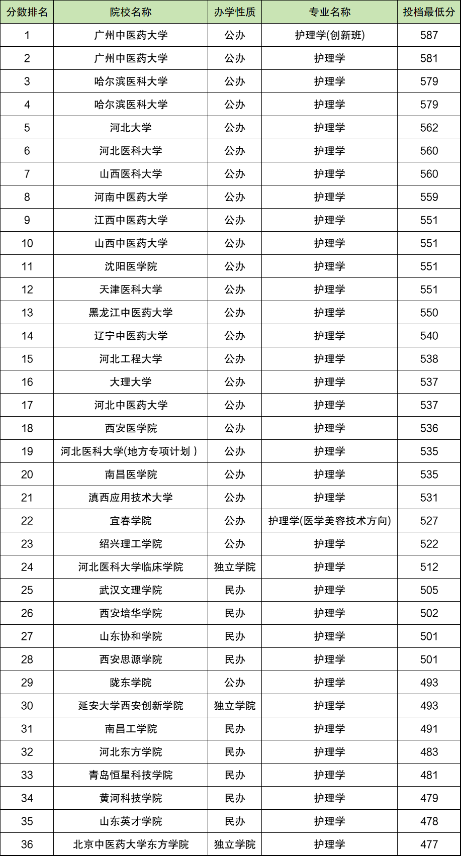 2025年全国本科大学中,护理学专业录取分数线位于477分-587分之间。
