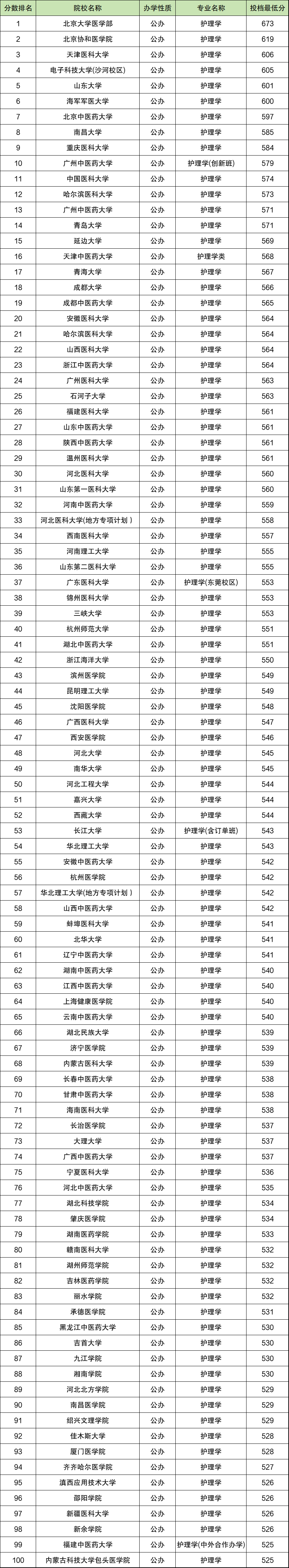 由于篇幅限制,以下为2025年护理学各校物理类录取分数线前100强:
