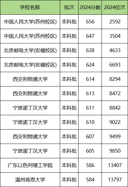 在这12所院校中,中外合作办学大学的最低录取线是584分,院校为温州肯恩大学。
