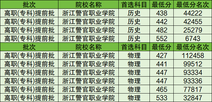 根据数据可知,2024年贵州省的专科警察大学只有浙江警官职业学院,历史类最低录取分为438分,物理类最低录取分为427分。