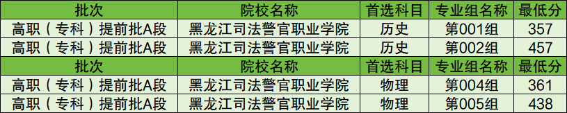 根据数据可知,2024年黑龙江省的专科警察大学只有黑龙江司法警官职业学院,历史类最低录取分为357分,物理类最低录取分为361分。