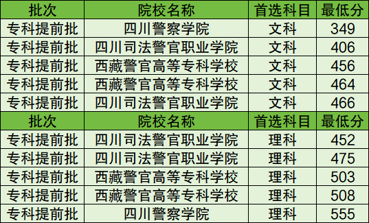 根据数据可知,2024年四川文科收分最低的专科警察大学有四川警察学院,最低录取分为349分;理科收分最低的有四川司法警官职业学院,最低录取分为452分。