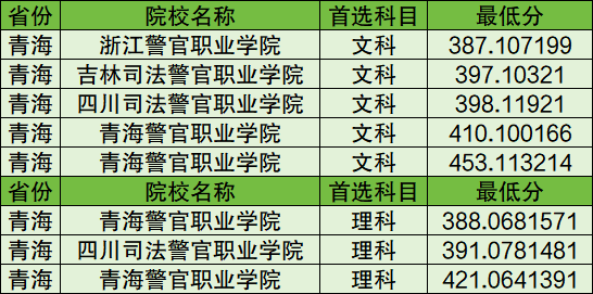 根据数据可知,2024年青海省文科收分最低的专科警察大学有浙江警官职业学院,最低录取分为387.107199分;理科收分最低的有青海警官职业学院,最低录取分为388.0681571分。