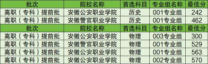 根据数据可知,2024年安徽省的专科警察大学只有安徽公安职业学院,历史类最低录取分为242分,物理类最低录取分为300分。