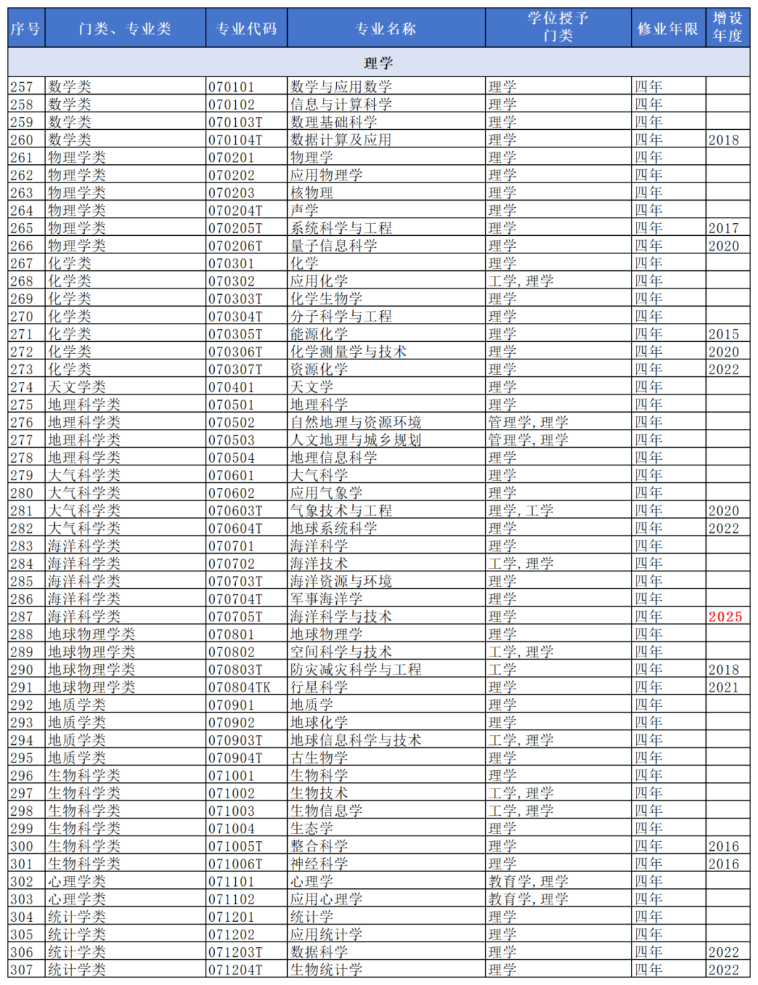 理学门类下设数学、物理学、化学、天文学、地理科学、大气科学、海洋科学、地球物理学、地质学、生物科学、心理学、统计学等几类专业。