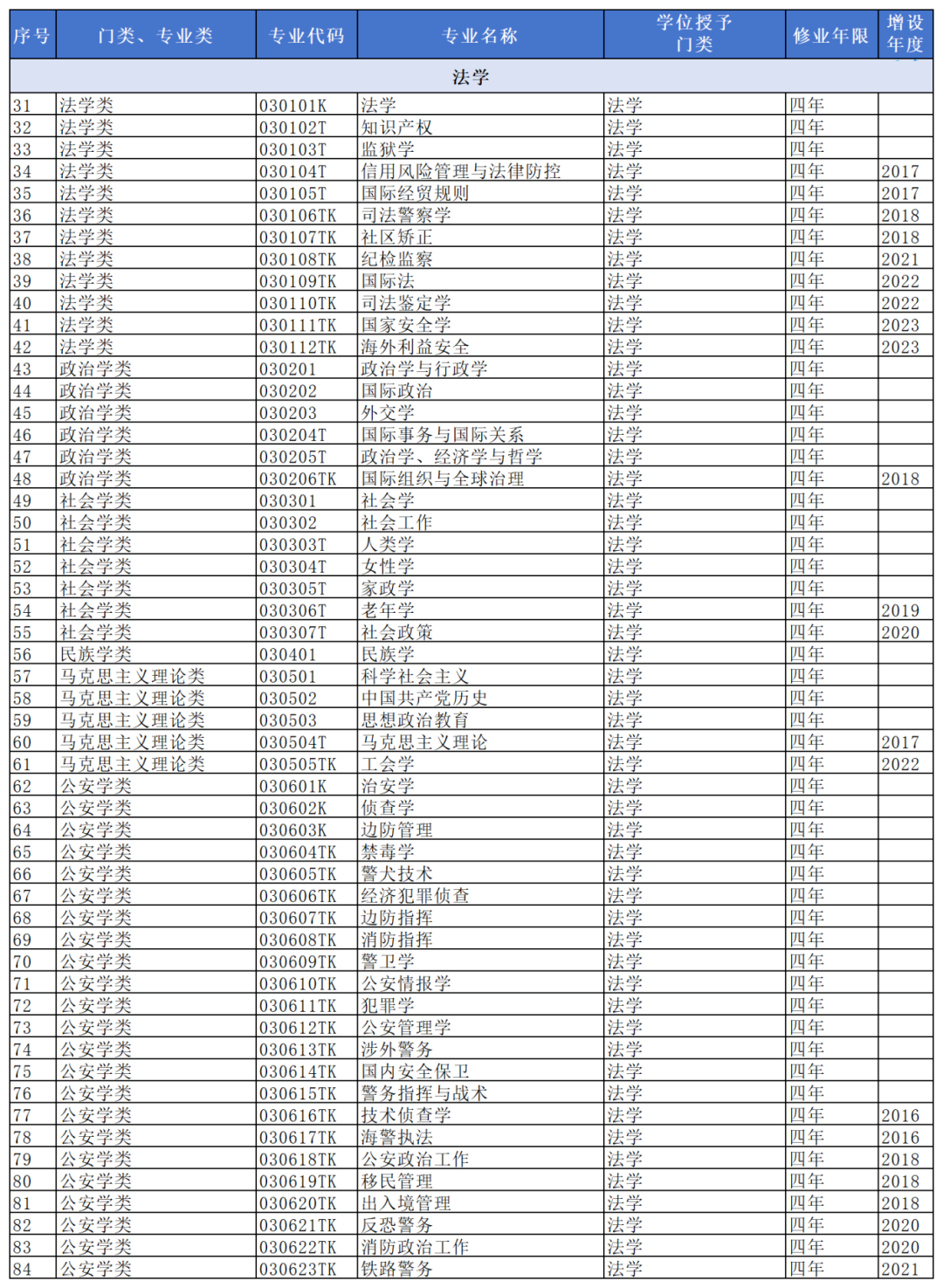 法学门类下有法学、政治学、社会学、民族学、马克思主义理论、公安学等几类专业。