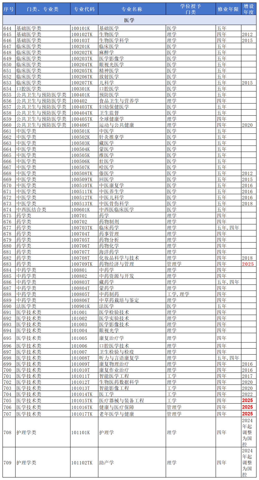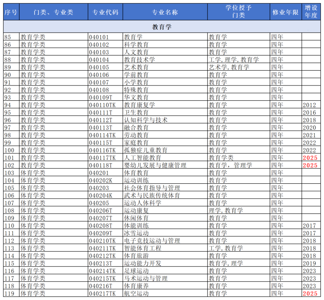 教育部在2025年4月1日发布了最新版《普通高等学校本科专业目录》,包含93个专业类、845种专业。这845种专业覆盖了12大学科门类,包括理学、工学、医学、农学、文学、历史学、哲学、经济学、管理学、法学、教育学、艺术学。
