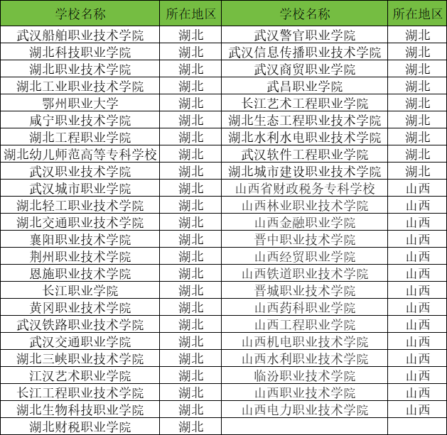 3+2专本贯通学校招生的大学有武汉船舶职业技术学院、湖北科技职业学院、湖北职业技术学院、湖北工业职业技术学院、鄂州职业大学、咸宁职业技术学院、湖北工程职业学院、湖北幼儿师范高等专科学校、武汉职业技术学院、武汉城市职业学院等,共计33所(湖北),具体名单如下表所示(以湖北、山西为例):