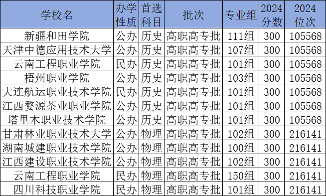 历史类300分能上的有新疆和田学院、天津中德应用技术大学、云南工程职业学院、梧州职业学院等;物理类300分能上的有甘肃林业职业技术大学、湖南城建职业技术学院、江西建设职业技术学院、云南工程职业学院等。
