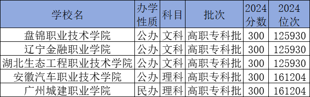 文科300分能上的大学有盘锦职业技术学院、辽宁金融职业学院、湖北生态工程职业技术学院;理科300分能上的大学有安徽汽车职业技术学院、广州城建职业学院。