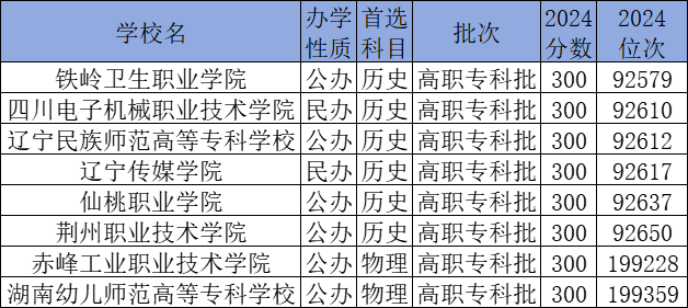 历史类300分能上的有铁岭卫生职业学院、四川电子机械职业技术学院、辽宁民族师范高等专科学校、辽宁传媒学院、仙桃职业学院等;物理类300分能上的有赤峰工业职业技术学院、湖南幼儿师范高等专科学校。