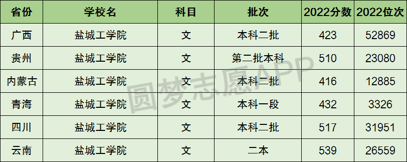 1、盐城工学院在全国普通高考省份的【文科】招录数据,包含招生批次等信息:
