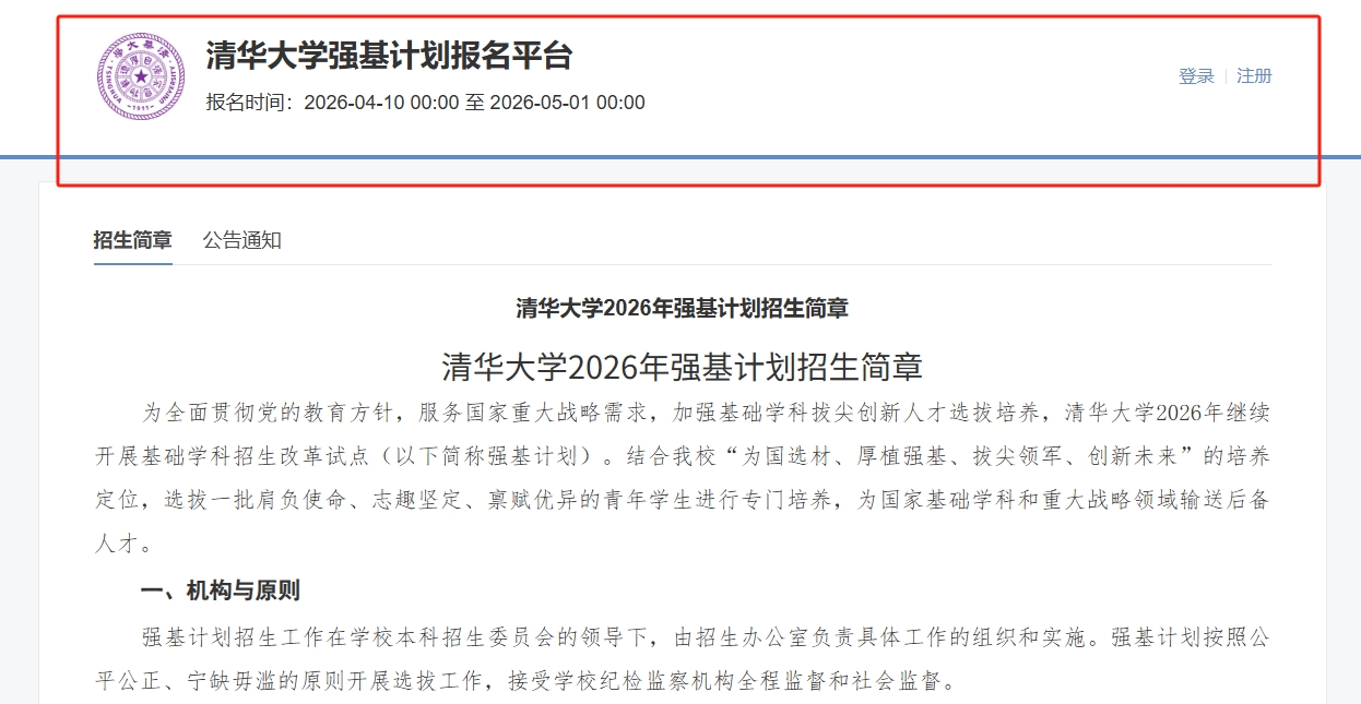 2026年清华大学强基计划招生简章已于4月10日公布,该校强基报名时间为4月10日-4月30日,招生专业包含信息与计算科学、生物科学、理论与应用力学、历史学类等。