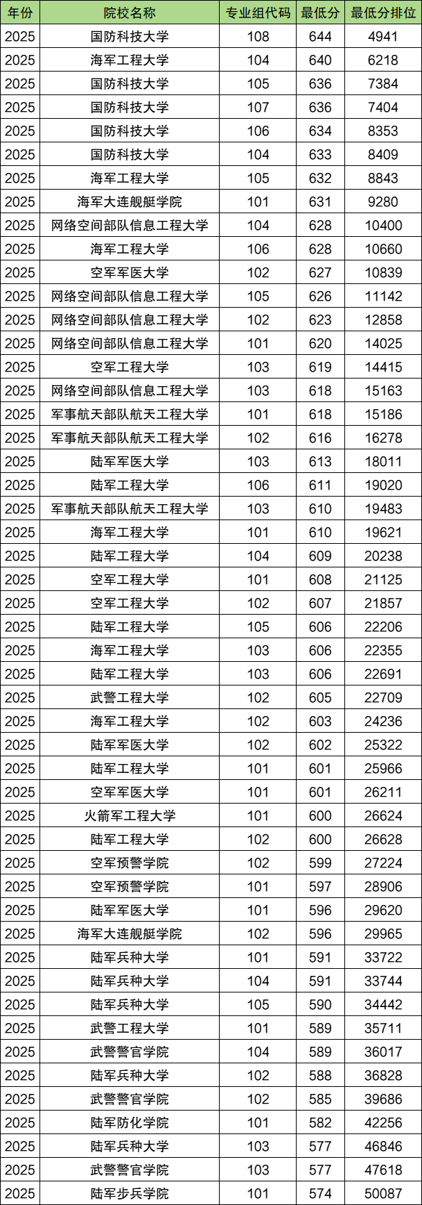 2025年提前批军校最低录取分数线为574分,超特控线40分。即所有军校提前批分数线均在特控线以上,其中分数线较低的有陆军兵种大学103组(577分)、陆军步兵学院101组(574分)、陆军防化学院101组(582分)、武警警官学院103组(577分)等。