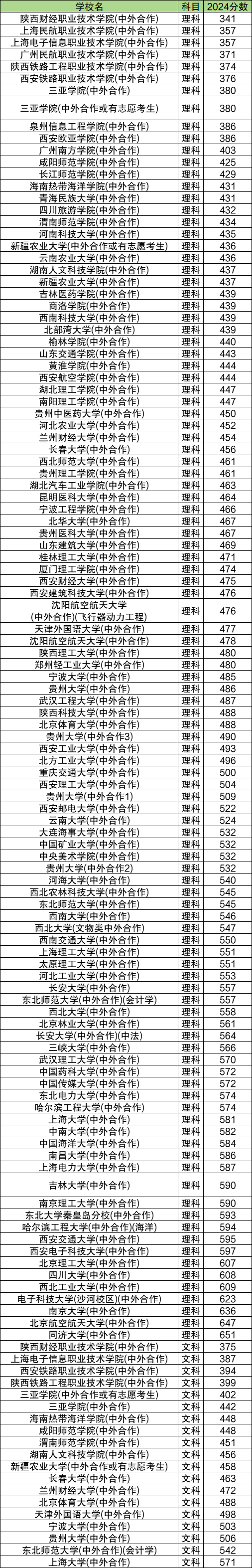 小编在此以内蒙古和陕西为例,整理了2024年中外合作大学在这两个省市的录取分数线,如下: