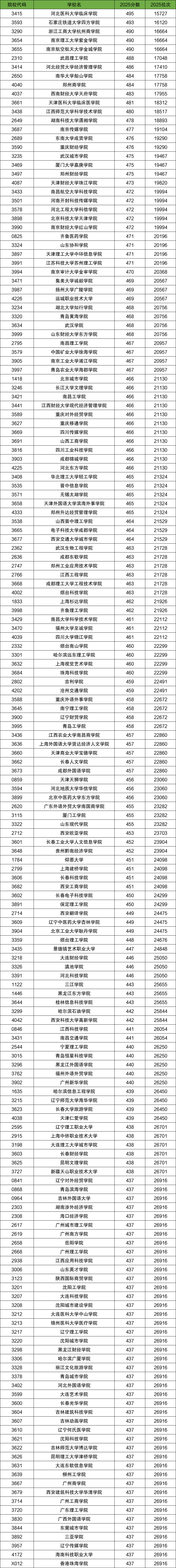 物理类分数线最高的是河北医科大学临床学院(代号3415),2025年最低分494,最低位次59521名。其次是湖北医药学院药护学院(代号3249),2025年最低分487,对应最低位次63041名。