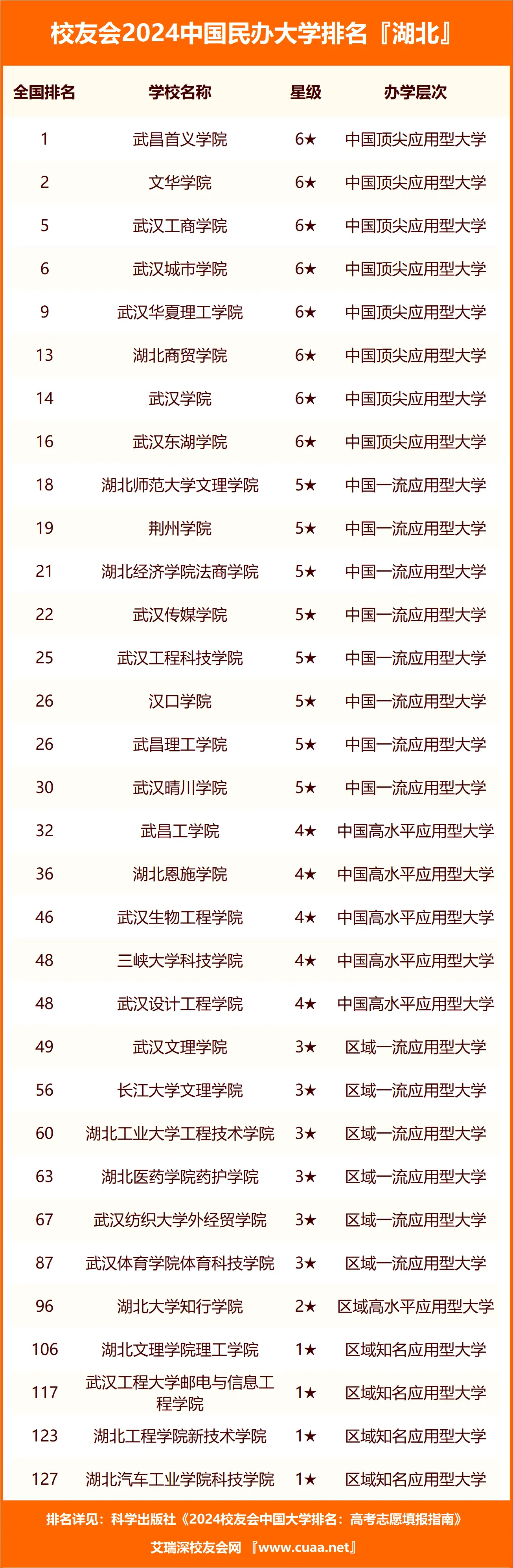 我们从校友会官方获取到了2024年全国民办本科院校的排名情况,同时我们为大家整理了2024年所有湖北民办本科院校的排名数据如下: