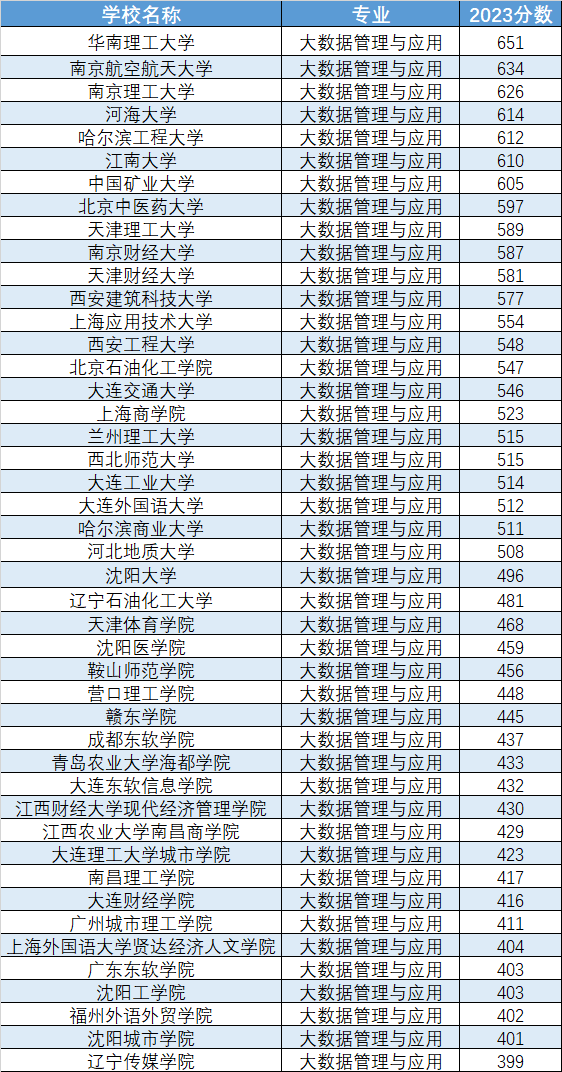 以下是2023年各大学大数据管理与应用专业在辽宁省物理组的最低录取分数(供参考,以下数据不包含大类招生、工科试验班、中外合作办学录取分数):