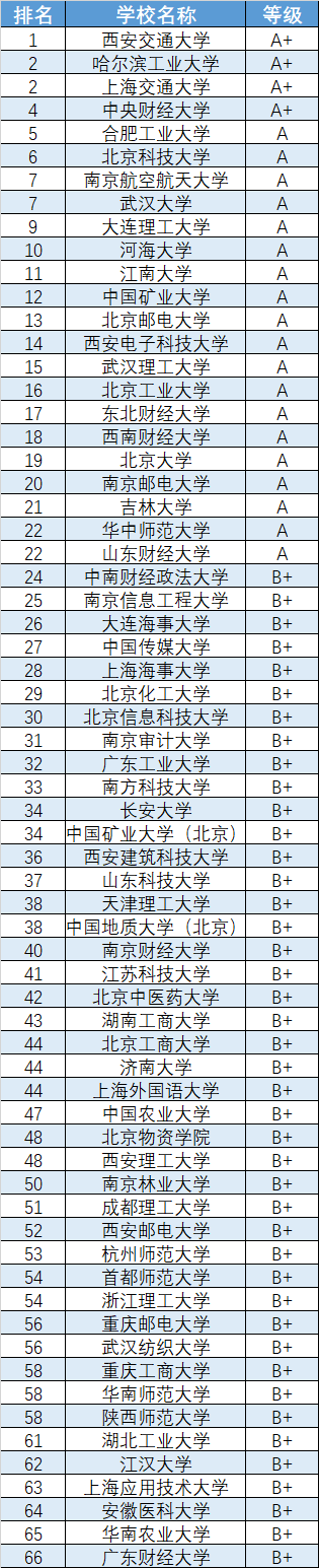 在2023年软科专业排名中,该专业排名B+等级以上的院校共有66所。排名前十的大学有西安交通大学、哈尔滨工业大学、上海交通大学、中央财经大学、合肥工业大学、北京科技大学、南京航空航天大学、武汉大学、大连理工大学、河海大学。