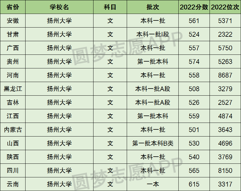 1、扬州大学在全国普通高考省份的【文科】招录数据,包含招生批次等信息: