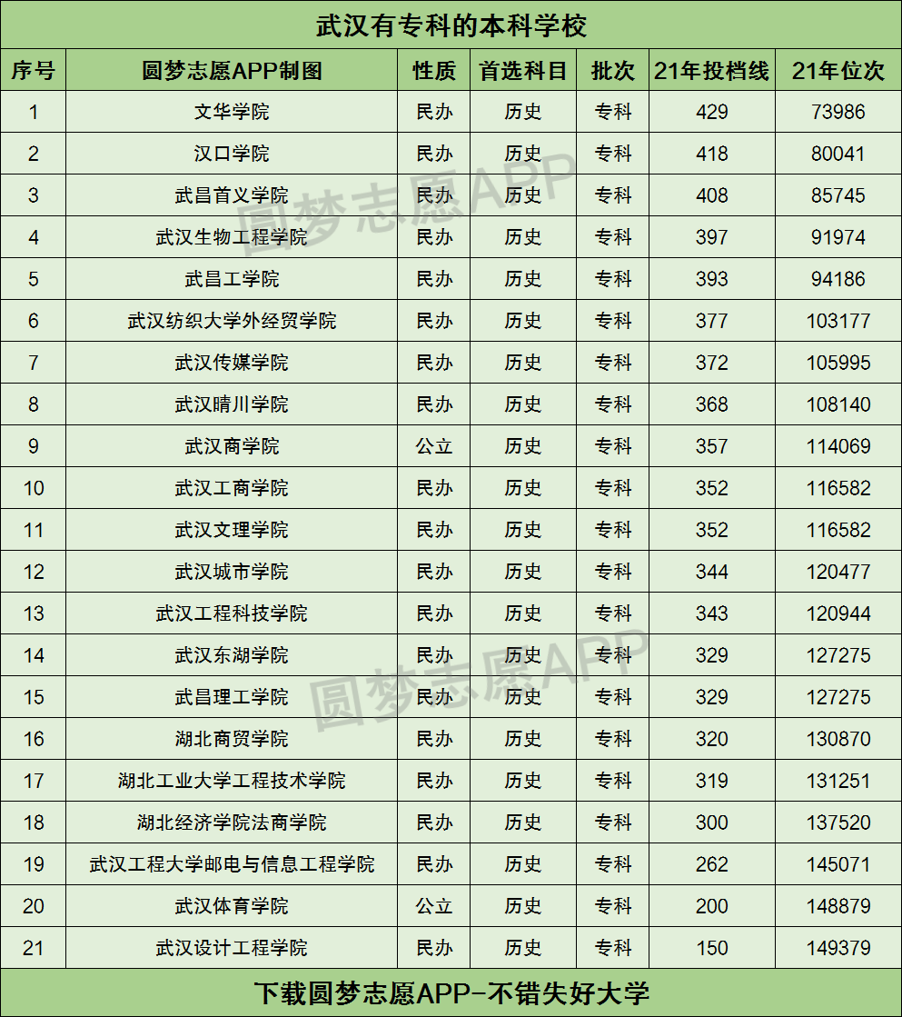 根据湖北考试院公布的数据,圆梦志愿小编为大家整理了位于武汉市内、且在专科批次有招生的本科大学名单,其中包含2所公办大学和19所民办大学。
