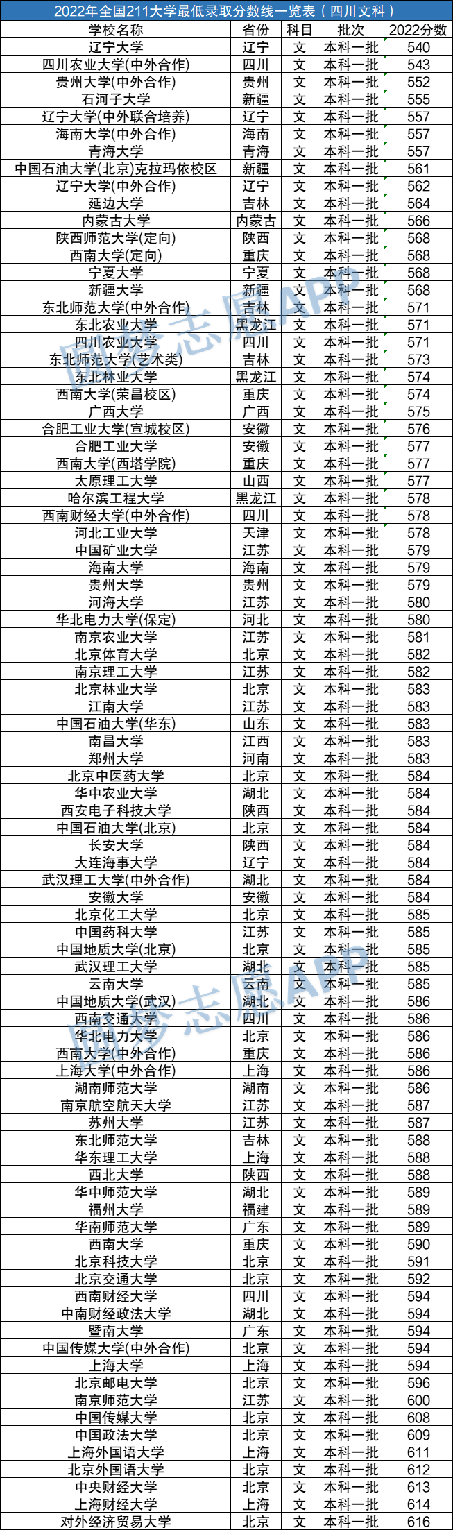 可以看到,211大学在四川省文科考生的最低录取分数线在540-616分之间。