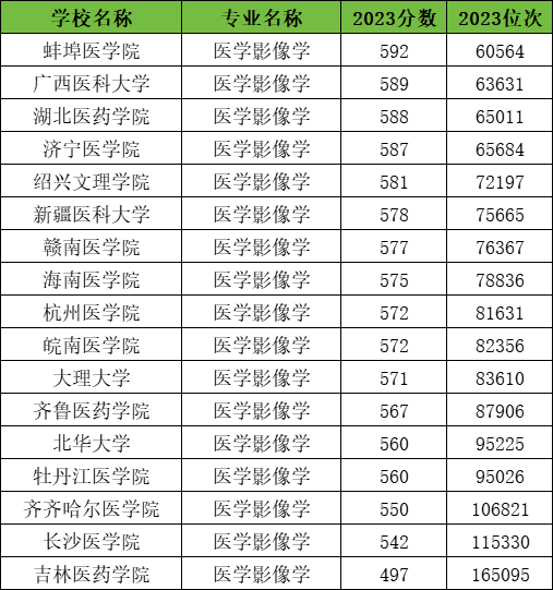 医学影像学专业录取分数最低的二本大学是吉林医药学院,2023年最低分为497分,最低录取位次为第165095名;收分比较低的医学影像学专业二本院校还有长沙医学院542分、齐齐哈尔医学院550分、牡丹江医学院560分等。