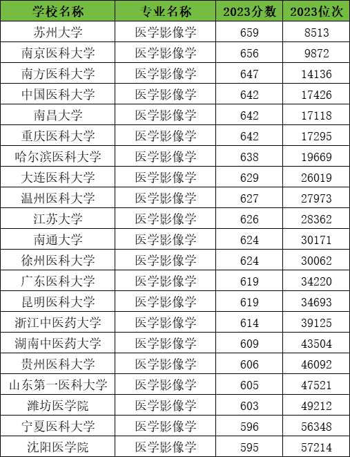 从下表录取数据来看,医学影像学专业录取的一本院校多为医药类大学,如南京医科大学656分、南方医科大学647分、浙江中医药大学614分、潍坊医学院603分等;少数为综合性大学,如南昌大学642分、江苏大学626分、南通大学624分。
