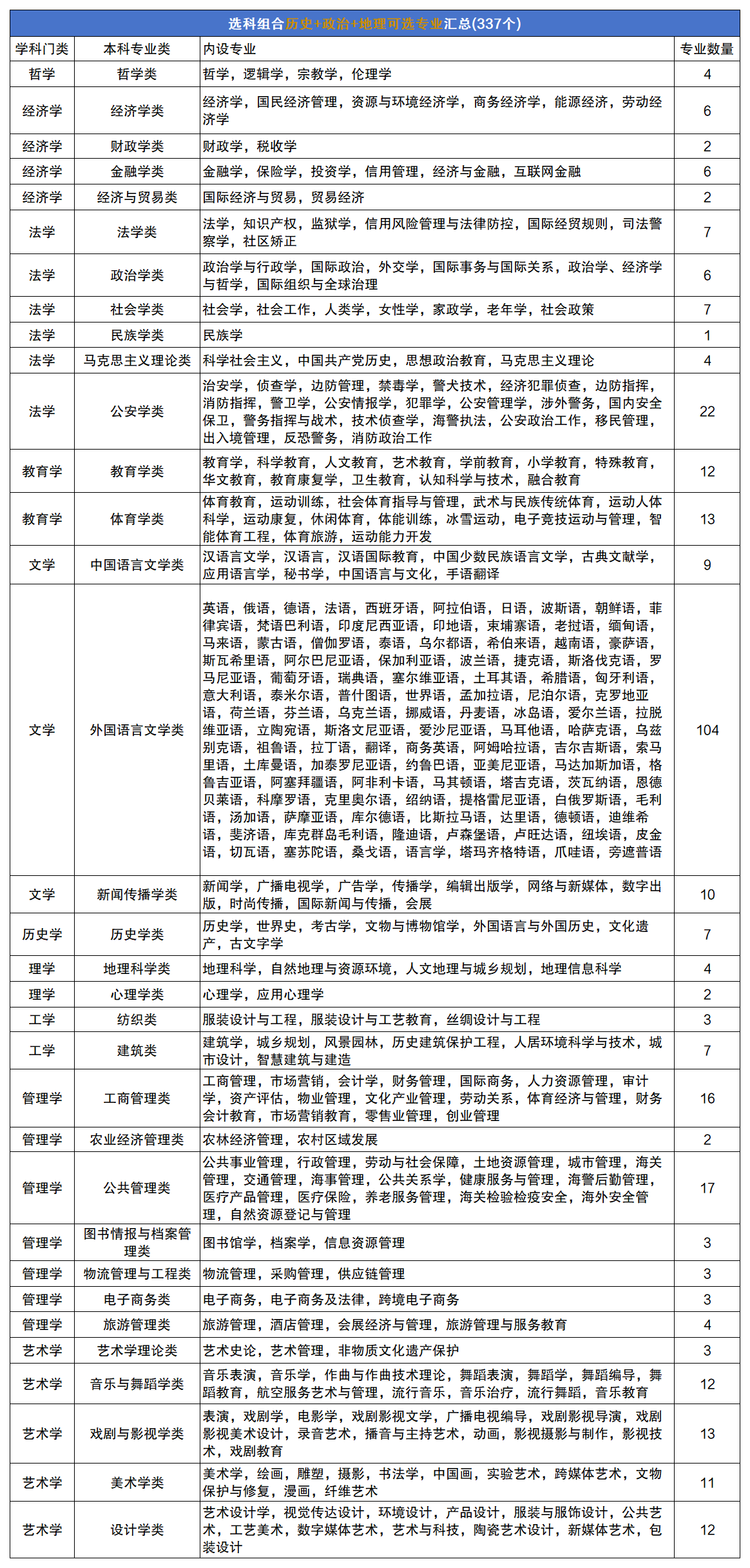 根据教育部指引目录的信息来看,历地政2025可选专业共计337个,完整的专业统计表直接见下: