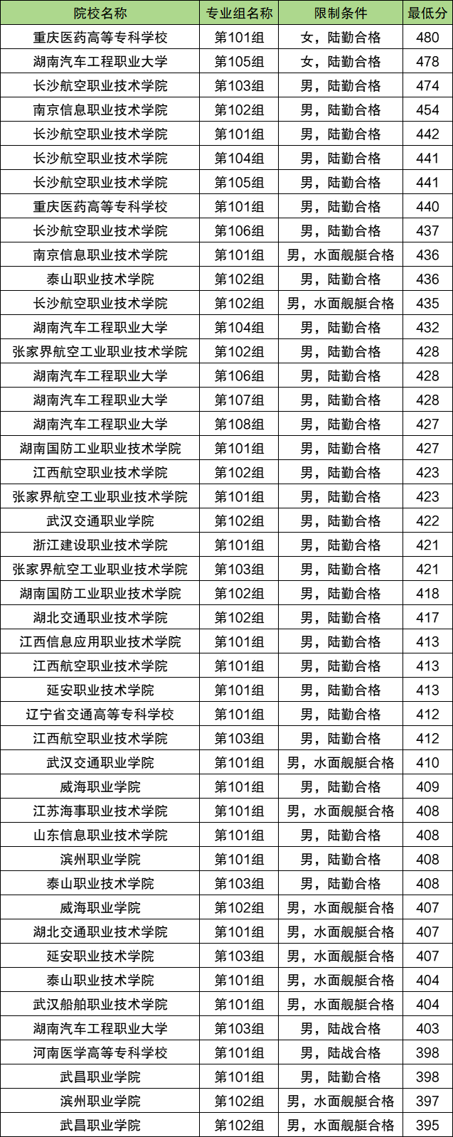 除此之外,收分较低的定向士官院校专业(组)还有:滨州职业学院第102组397分、武昌职业学院第101组398分、河南医学高等专科学校第101组398分、湖南汽车工程职业大学第103组403分。