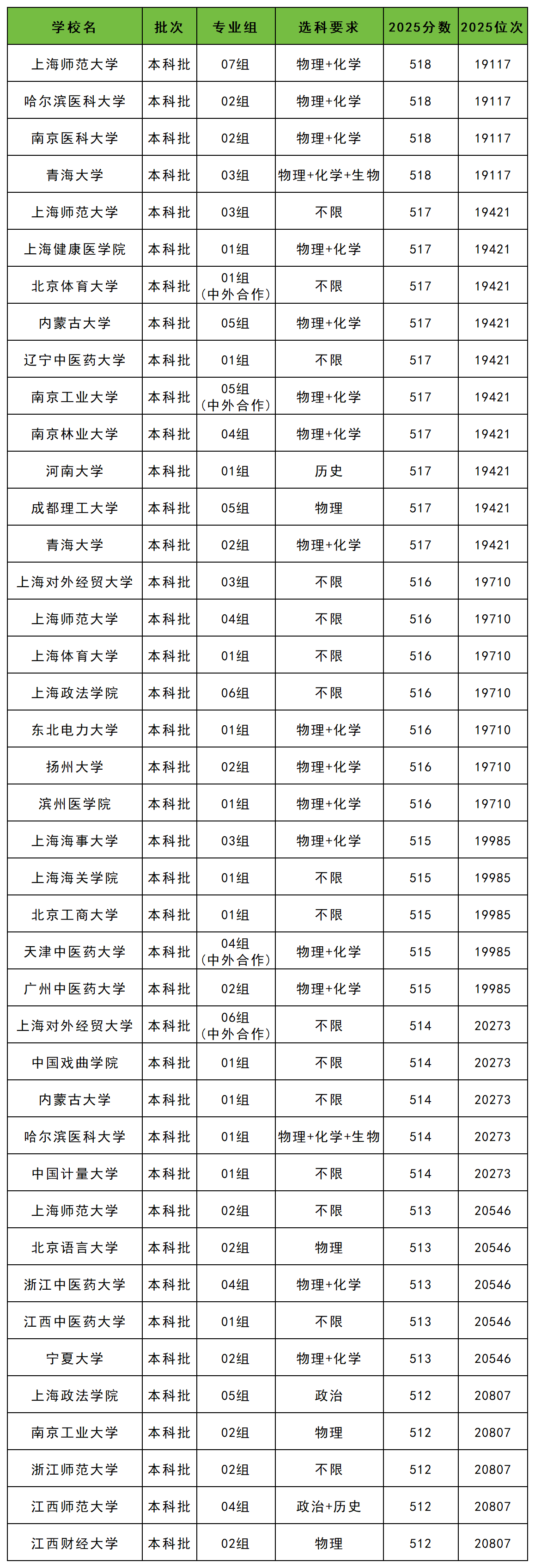 2万名左右最高位次对应的院校专业组有上海师范大学(07组)、哈尔滨医科大学(02组)、南京医科大学(02组)等,最低录取位次为19117位,位次对应分数为518分;