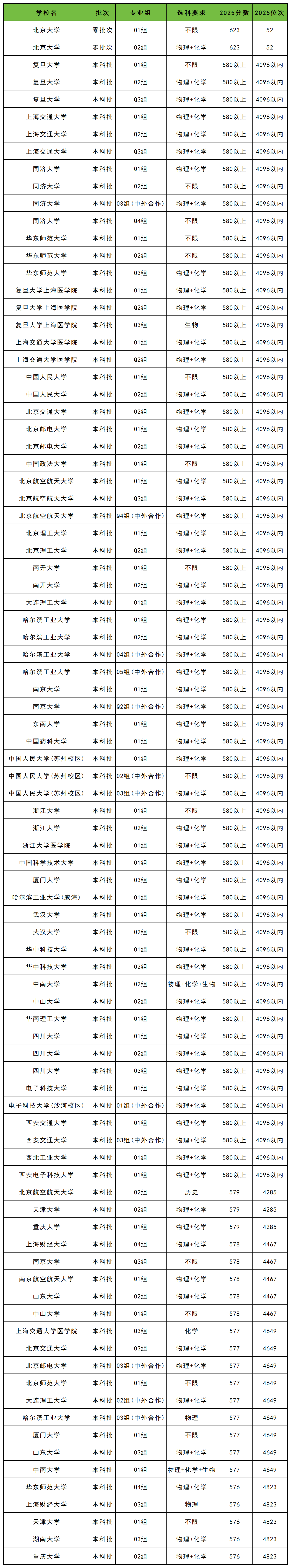 5千名以内最低位次对应的院校专业组有重庆大学(02组)、湖南大学(03组)、天津大学(01组)等,最低录取位次为4823位,位次对应分数为576分。