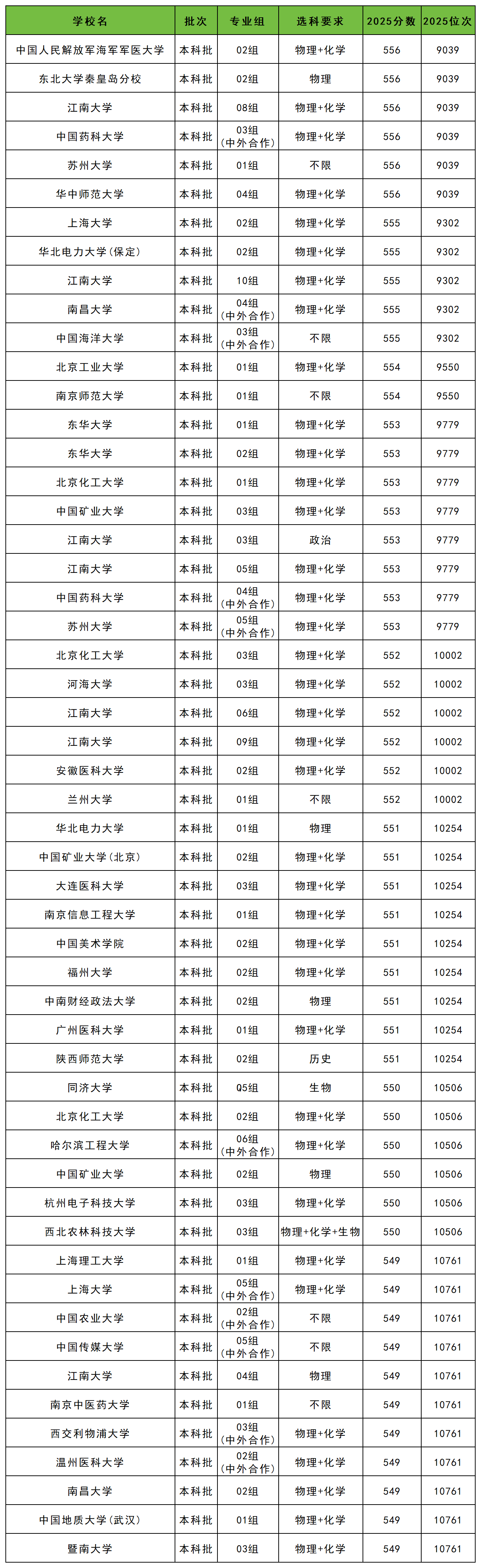 1万名左右最低位次对应的院校专业组有暨南大学(03组)、南昌大学(02组)、南京中医药大学(01组)等,最低录取位次为10761位,位次对应分数为549分。
