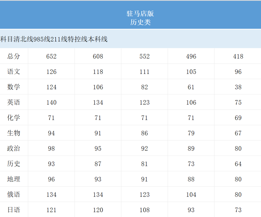 历史类:清北线652分、985线608分、211线552分、特控线496分、本科线418分