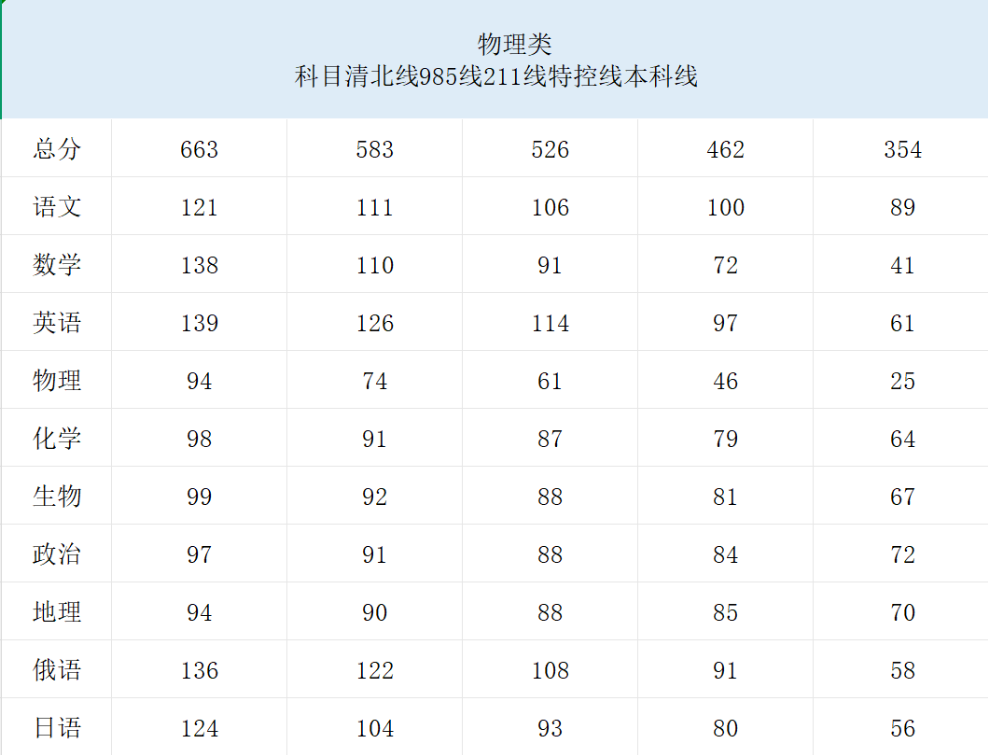 物理类:清北线663分、985线583分、211线526分、特控线462分、本科线354分