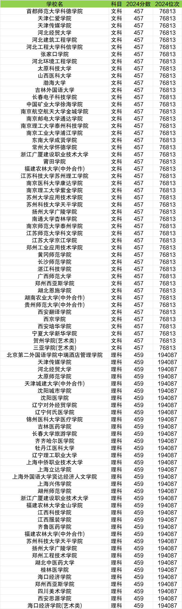 四川省2024年二本院校最低分:文科457分、理科459分。