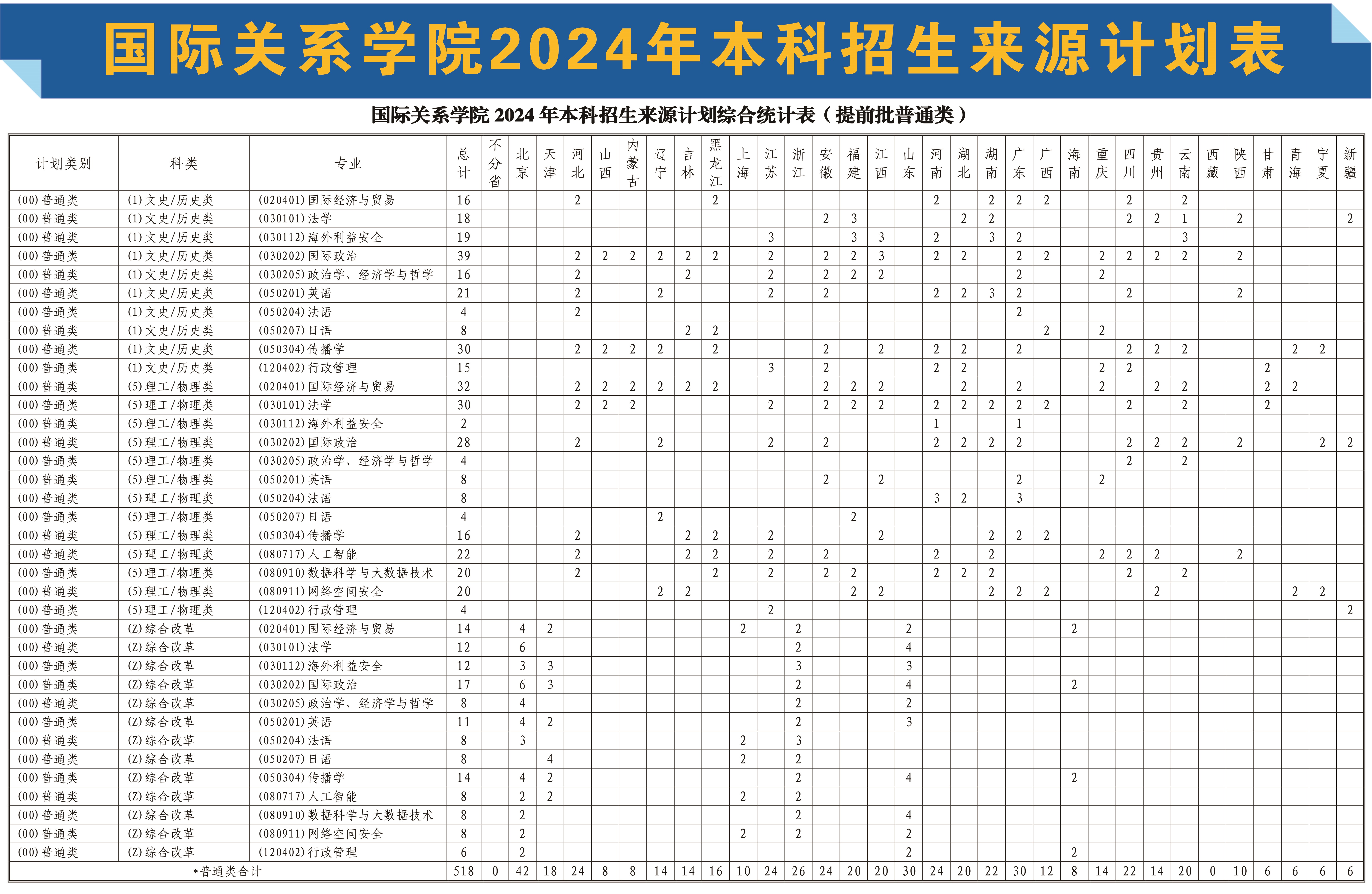2024国际关系学院面向全国16个省(自治区、直辖市)招生560名,招生专业包括法学、英语等,招生计划最多的三个地区是北京(42人)、江苏(26人)、河北(24人)。