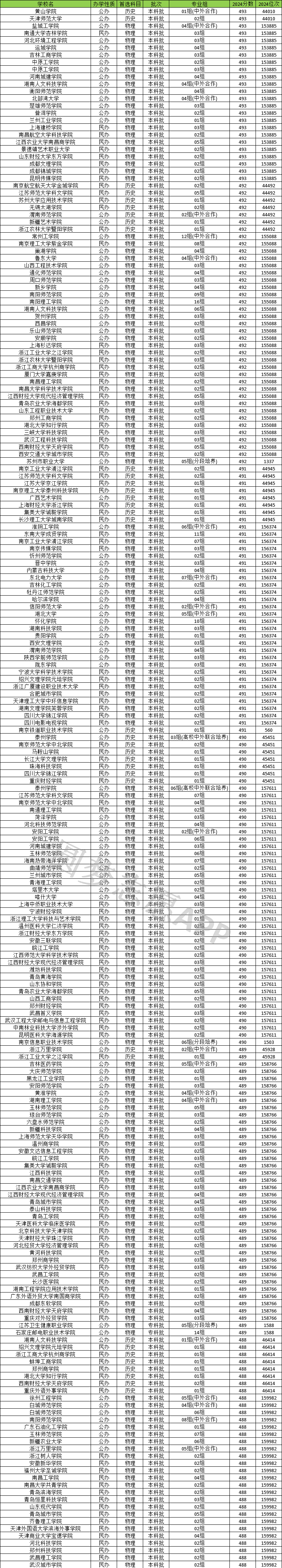 在江苏省490分左右(488分-493分之间)的可以上大学,本科历史类有34所,专科历史类1所;其中公办院校9所,有天津师范大学(493分)、广西艺术学院(491分)、黄山学院(493分)等;民办院校25所,有南京航空航天大学金城学院(492分)、江苏师范大学科文学院(492分)、苏州大学应用技术学院(492分)等。