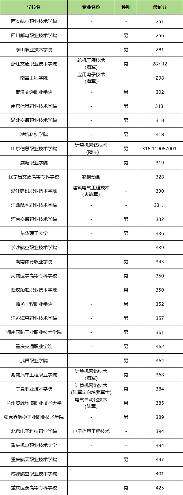 其中最好考的定向士官院校是西安航空职业技术学院,2024年最低录取分为251分。