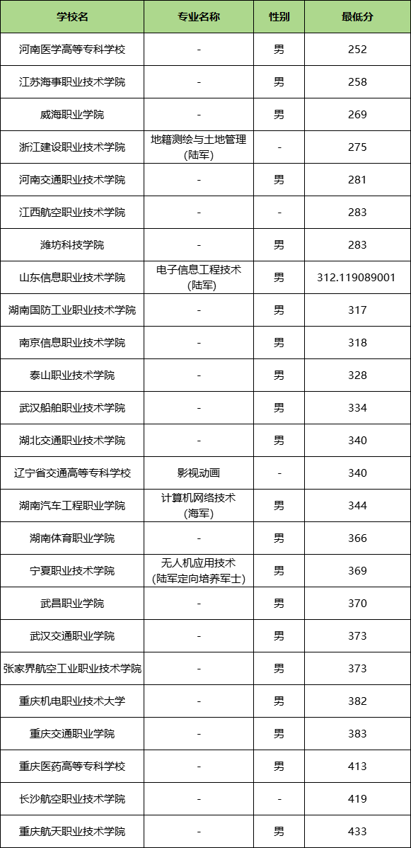 本文收集汇总了2024年重庆定向士官学校各科类最低录取分数,以供同学们参考。